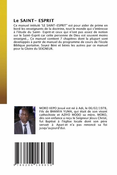 Ce manuel intitulé "LE SAINT-ESPRIT" est pour aider de prime en bord les enseignants de la doctrine, tout le monde qui s'intéresse à l'étude du Saint- Esprit et ceux qui n'ont pas assez de notion sur le Saint-Esprit car cette personne de Dieu est souvent moins enseigné... Ce manuel contient 7 chapitres dont la plupart sont developpés à partir de manuel du programme de cours de l'école Biblique portative. Soyez Béni et bénis les autres par ce manuel pour la Gloire du SEIGNEUR.