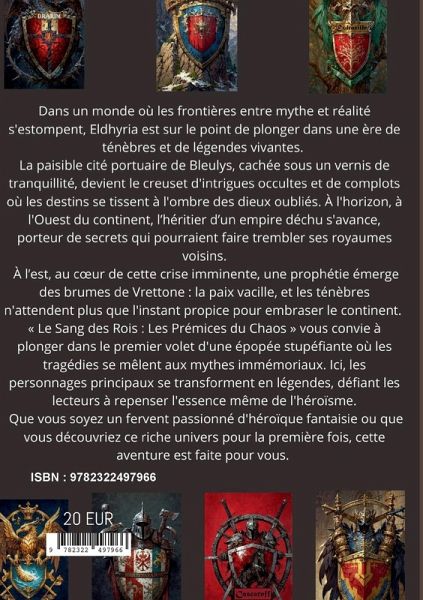 Dans un monde où les frontières entre mythe et réalité s'estompent, Eldhyria est sur le point de plonger dans une ère de ténèbres et de légendes vivantes. La paisible cité portuaire de Bleulys, cachée sous un vernis de tranquillité, devient le creuset d'intrigues occultes et de complots où les destins se tissent à l'ombre des dieux oubliés. A l'horizon, à l'Ouest du continent, l'héritier d'un empire déchue s'avance, porteur de secrets qui pourrait faire trembler les royaumes voisins. A l'Est, au coeur de cette crise imminente, une prophétie émerge des brumes de Vrettone : la paix vacille, et les ténèbres n'attendent plus que l'instant propice pour embraser le continent. « Le Sang des Rois : Les Prémices du Chaos » vous convie à plonger dans le premier volet d'une épopée stupéfiante où les tragédies se mêlent aux mythes immémoriaux. Ici, les personnages principaux se transforment en légendes, défiant les lecteurs à repenser l'essence même de l'héroïsme. Que vous soyez un fervent passionné d'héroïque fantaisie ou que vous découvriez ce riche univers pour la première fois, cette aventure est faite pour vous. Laissez-vous emporter par le souffle épique de ce récit fascinant, où le chant d'une nouvelle ère attend d'être découvert. Plongez, et préparez vous à faire partie d'une histoire qui marquera à jamais vos souvenirs.