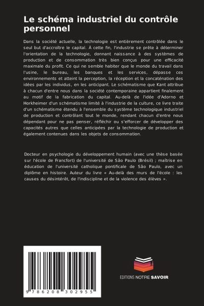 Dans la société actuelle, la technologie est entièrement contrôlée dans le seul but d'accroître le capital. À cette fin, l'industrie se prête à déterminer l'orientation de la technologie, donnant naissance à des systèmes de production et de consommation très bien conçus pour une efficacité maximale du profit. Ce qui ne semble habiter que le monde du travail dans l'usine, le bureau, les banques et les services, dépasse ces environnements et atteint la perception, la réception et la concaténation des idées par les individus, en les anticipant. Le schématisme que Kant attribue à chacun d'entre nous dans la société contemporaine appartient finalement au motif de la fabrication du capital. Au-delà de l'idée d'Adorno et Horkheimer d'un schématisme limité à l'industrie de la culture, ce livre traite d'un schématisme étendu à l'ensemble du système technologique industriel de production et contrôlant tout le monde, rendant chacun d'entre nous dépendant pour ne pas penser, réfléchir ou s'efforcer de développer des capacités autres que celles anticipées par la technologie de production et également contenues dans les objets de consommation.