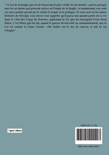 " La Loi de la Jungle qui est de beaucoup la plus vieille loi du monde a prévu presque tous les accidents qui peuvent arriver au Peuple de la Jungle ; et maintenant, son code est aussi parfait qüont pu le rendre le temps et la pratique. Si vous avez lu les autres histoires de Mowgli, vous devez vous rappeler qüil passa une grande partie de sa vie dans le Clan des Loups de Seeonee, apprenant la Loi que lui enseignait l¿ours brun Baloo. C¿est Baloo qui lui dit, quand le garçon devint rétif au commandement, que la Loi est comme la Liane Géante : elle tombe sur le dos de chacun, et nul ne lui échappe."
