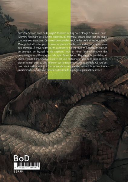 Dans "Le Second Livre de la jungle", Rudyard Kipling nous plonge à nouveau dans l'univers fascinant de la jungle indienne, où Mowgli, l'enfant élevé par les loups, continue ses aventures. Ce recueil de nouvelles explore les défis et les leçons que Mowgli doit affronter pour trouver sa place entre le monde des hommes et celui des animaux. À travers des récits captivants, Kipling met en lumière les valeurs de courage, de loyauté et de sagesse, tout en nous faisant découvrir des personnages emblématiques tels que Baloo l'ours, Bagheera la panthère, et Shere Khan le tigre. Chaque histoire est une métaphore riche de la lutte entre le bien et le mal, ainsi qu'une réflexion sur la nature humaine et animale. Ce livre est une ode à la diversité et à l'harmonie de la vie sauvage, invitant le lecteur à une immersion totale dans un monde où les lois de la jungle régissent l'existence.