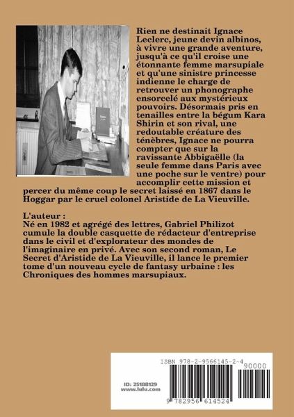Rien ne destinait Ignace Leclerc, jeune devin albinos, à vivre une grande aventure, jusqu'à ce qu'il croise une étonnante femme marsupiale et qu'une sinistre princesse indienne le charge de retrouver un phonographe ensorcelé aux mystérieux pouvoirs. Désormais pris en tenailles entre la bégum Kara Shirin et son rival, une redoutable créature des ténèbres, Ignace ne pourra compter que sur la ravissante Abbigaëlle (la seule femme dans Paris avec une poche sur le ventre) pour accomplir cette mission et percer du même coup le secret laissé en 1867 dans le Hoggar par le cruel colonel Aristide de La Vieuville. Vous voulez de la bit-lit originale ? Vous en avez assez des succédanés de Twilight, Anita Blake et autres Cités des ténèbres ? Alors découvrez vite le premier tome des Chroniques des hommes marsupiaux. Là-dedans, pas de vampires, pas de loups-garous, mais des marsupiaux humanoïdes, des phonographes magiques et des créatures de l'au-delà telles qu'aucun auteur de fantasy n'en a encore imaginées.