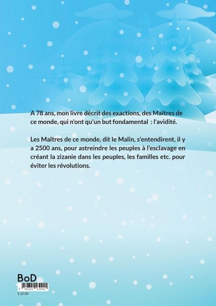 A 78 ans, mon livre décrit des exactions, des Maîtres de ce monde, qui n'ont qu'un but fondamental : l'avidité. Les Maîtres de ce monde, dit le Malin, s'entendirent, il y a 2500 ans, pour astreindre les peuples à l'esclavage en créant la zizanie dans les peuples, les familles etc. pour éviter les révolutions.