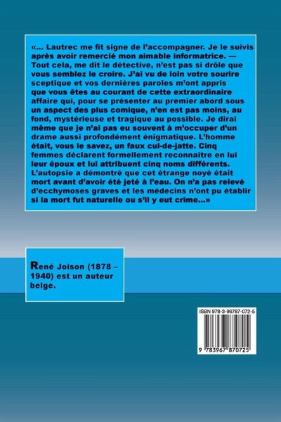 «... Lautrec me fit signe de l’accompagner. Je le suivis après avoir remercié mon aimable informatrice. — Tout cela, me dit le détective, n’est pas si drôle que vous semblez le croire. J’ai vu de loin votre sourire sceptique et vos dernières paroles m’ont appris que vous êtes au courant de cette extraordinaire affaire qui, pour se présenter au premier abord sous un aspect des plus comique, n’en est pas moins, au fond, mystérieuse et tragique au possible. Je dirai même que je n’ai pas eu souvent à m’occuper d’un drame aussi profondément énigmatique. L’homme était, vous le savez, un faux cul-de-jatte. Cinq femmes déclarent formellement reconnaître en lui leur époux et lui attribuent cinq noms différents. L’autopsie a démontré que cet étrange noyé était mort avant d’avoir été jeté à l’eau. On n’a pas relevé d’ecchymoses graves et les médecins n’ont pu établir si la mort fut naturelle ou s’il y eut crime...»