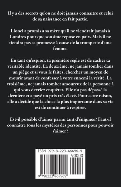 Il y a des secrets qu'on ne doit jamais connaître et celui de sa naissance en fait partie. Lionel a promis à sa mère qu'il ne viendrait jamais à Londres pour que son âme repose en paix. Mais il ne tiendra pas sa promesse à cause de la tromperie d'une femme. En tant qu'espion, ta première règle est de cacher ta véritable identité. La deuxième, ne jamais tomber dans un piège et si vous le faites, chercher un moyen de mourir avant de confesser à votre ennemi la vérité. La troisième, ne jamais tomber amoureux de la personne à qui vous devriez enquêter. Elle n'a pas dépassé la dernière et a payé un prix très élevé. Pour cette raison, elle a décidé que la chose la plus importante dans sa vie est de continuer à respirer. Est-il possible d'aimer parmi tant d'énigmes? Faut-il connaître tous les mystères des personnes pour pouvoir s'aimer?