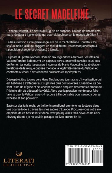Un secret interdit... Le destin de l'Église en suspens... Un duo de limiers amateurs révélera-t-il une vérité qui pourrait bouleverser le monde chrétien ? La Résurrection est la pierre angulaire de la foi chrétienne. Toutefois, lorsqu'un indice jaillit qui suggère un récit différent, les conséquences pourraient bien changer la chrétienté à jamais. Le poste du prêtre Michael Dominic aux légendaires Archives secrètes du Vatican l'amène à découvrir un papyrus perdu, enseveli dans les sous-sols de Rome : les écrits jusqu'alors inconnus de Marie Madeleine. La révélation hérétique de la relique oubliée menace la légitimité même du Vatican et confronte Michael à des ennemis puissants et impitoyables. Désespéré, il se tourne vers Hana Sinclair, une journaliste d'investigation qui est habituée à s'attaquer aux sujets les plus controversés. Ensemble, ils défient l'élite de l'Église et se lancent dans une enquête dans les zones d'ombre de l'histoire afin de découvrir la vérité. Alors que la pression monte pour faire taire le duo, le Vatican aura-t-il recours à l'impensable pour sauvegarder sa richesse et son pouvoir ? Basé sur des faits réels, ce thriller international emmène les lecteurs dans une course folle à travers les sites sacrés d'Europe. Procurez-vous votre exemplaire de ce best-seller et découvrez pourquoi les fans dévoués de Gary McAvoy disent : Je ne voulais pas que ce livre prenne fin ! .