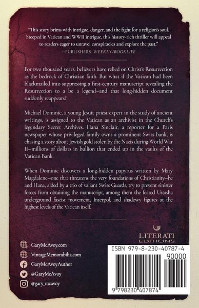 Un secret interdit... Le destin de l'Église en suspens... Un duo de limiers amateurs révélera-t-il une vérité qui pourrait bouleverser le monde chrétien ? La Résurrection est la pierre angulaire de la foi chrétienne. Toutefois, lorsqu'un indice jaillit qui suggère un récit différent, les conséquences pourraient bien changer la chrétienté à jamais. Le poste du prêtre Michael Dominic aux légendaires Archives secrètes du Vatican l'amène à découvrir un papyrus perdu, enseveli dans les sous-sols de Rome : les écrits jusqu'alors inconnus de Marie Madeleine. La révélation hérétique de la relique oubliée menace la légitimité même du Vatican et confronte Michael à des ennemis puissants et impitoyables. Désespéré, il se tourne vers Hana Sinclair, une journaliste d'investigation qui est habituée à s'attaquer aux sujets les plus controversés. Ensemble, ils défient l'élite de l'Église et se lancent dans une enquête dans les zones d'ombre de l'histoire afin de découvrir la vérité. Alors que la pression monte pour faire taire le duo, le Vatican aura-t-il recours à l'impensable pour sauvegarder sa richesse et son pouvoir ? Basé sur des faits réels, ce thriller international emmène les lecteurs dans une course folle à travers les sites sacrés d'Europe. Procurez-vous votre exemplaire de ce best-seller et découvrez pourquoi les fans dévoués de Gary McAvoy disent : Je ne voulais pas que ce livre prenne fin ! .