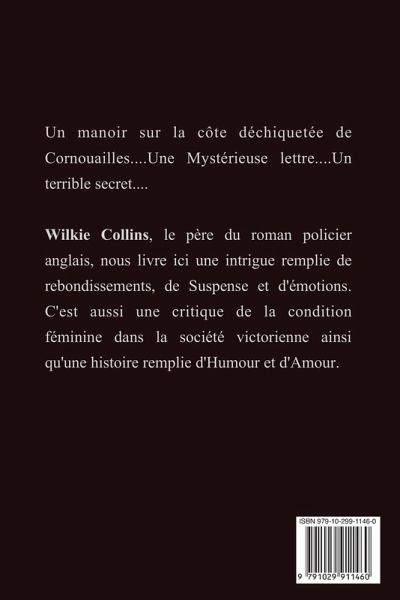 Un manoir sur la côte déchiquetée de Cornouailles....Une Mystérieuse lettre....Un terrible secret.... Wilkie Collins, le père du roman policier anglais, nous livre ici une intrigue remplie de rebondissements, de Suspense et d'émotions. C'est aussi une critique de la condition féminine dans la société victorienne ainsi qu'une histoire remplie d'Humour et d'Amour. Cette édition est agrémentée d'une mise en page dont la taille des caractères est destinée à faciliter la lecture.