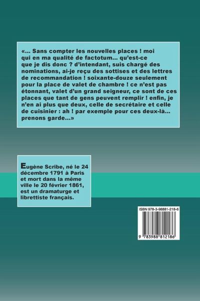... Sans compter les nouvelles places ! moi qui en ma qualité de factotum... qu'est-ce que je dis donc ? d'intendant, suis chargé des nominations, ai-je reçu des sottises et des lettres de recommandation ! soixante-douze seulement pour la place de valet de chambre ! ce n'est pas étonnant, valet d'un grand seigneur, ce sont de ces places que tant de gens peuvent remplir ! enfin, je n'en ai plus que deux, celle de secrétaire et celle de cuisinier : ah ! par exemple pour ces deux-là... prenons garde...