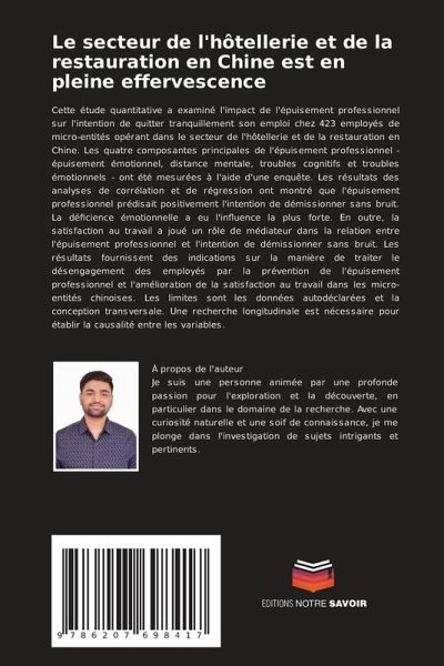 Cette étude quantitative a examiné l'impact de l'épuisement professionnel sur l'intention de quitter tranquillement son emploi chez 423 employés de micro-entités opérant dans le secteur de l'hôtellerie et de la restauration en Chine. Les quatre composantes principales de l'épuisement professionnel - épuisement émotionnel, distance mentale, troubles cognitifs et troubles émotionnels - ont été mesurées à l'aide d'une enquête. Les résultats des analyses de corrélation et de régression ont montré que l'épuisement professionnel prédisait positivement l'intention de démissionner sans bruit. La déficience émotionnelle a eu l'influence la plus forte. En outre, la satisfaction au travail a joué un rôle de médiateur dans la relation entre l'épuisement professionnel et l'intention de démissionner sans bruit. Les résultats fournissent des indications sur la manière de traiter le désengagement des employés par la prévention de l'épuisement professionnel et l'amélioration de la satisfaction au travail dans les micro-entités chinoises. Les limites sont les données autodéclarées et la conception transversale. Une recherche longitudinale est nécessaire pour établir la causalité entre les variables.