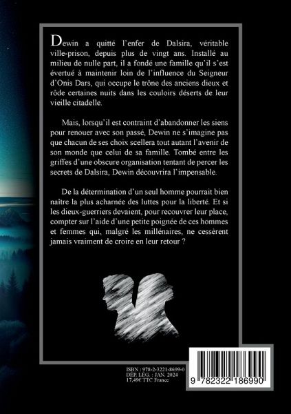 Dewin a quitté l'enfer de Dalsira, véritable ville-prison, depuis plus de vingt ans. Installé au milieu de nulle part, il a fondé une famille qu'il s'est évertué à maintenir loin de l'influence du Seigneur d'Onis Dars.Car cet être mystérieux que nul n'a jamais vu, occupant le trône des anciens dieux et rôdant certaines nuits dans les couloirs déserts de leur vieille citadelle, fait peser une terrible menace sur les peuples d'Hæna.Mais, lorsqu'il est contraint d'abandonner les siens pour renouer avec son passé, Dewin ne s'imagine pas que chacun de ses choix scellera tout autant l'avenir de son monde que celui de sa famille.Tombé entre les griffes d'une obscure organisation tentant de percer les secrets de Dalsira, Dewin découvrira l'impensable. De la détermination d'un seul homme pourrait bien naître la plus acharnée des luttes pour la liberté.Et si les dieux-guerriers devaient, pour recouvrer leur place, compter sur l'aide d'une poignée de ces hommes et femmes qui, malgré les millénaires, ne cessèrent jamais vraiment de croire en leur retour ?