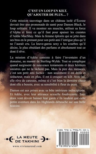 C'est un loup en kilt. Qu'ajouter de plus... ? Cette mission sauvetage dans un château isolé d'Écosse devrait être une promenade de santé pour Damon Black, le loup solitaire. Il va montrer ses muscles, utiliser sa force d'Alpha et faire ce qu'il faut pour apaiser les craintes d'Addie MacShay. Mais la femme éplorée qui se jette dans ses bras en le prenant pour son petit ami l'intrigue plus qu'il ne l'aurait cru. La louve-garou sexy a les courbes qu'il désire, le plus obsédant des parfums et absolument tout ce dont il rêve. La mission d'Addie consiste à faire l'inventaire d'un domaine, au manoir de Sterling-Wylde. Tout se complique quand surgissent de nouveaux testaments et deux héritiers sinistres qui ne la lâchent pas. Mais la pire des menaces, c'est son petit ami factice : non seulement il est drôle et séducteur, mais en plus, il est à croquer en kilt. Avec lui, elle rêve de caresses, même si c'est bien la dernière chose dont elle a besoin, avec sa sensibilité à fleur de peau. Damon est aux prises avec sa bête intérieure indisciplinée. Et Addie, avec leur attirance sexuelle foudroyante. Tous deux vont devoir baisser leur garde s'ils veulent que cette petite aventure dans les Highlands débouche sur une belle histoire.
