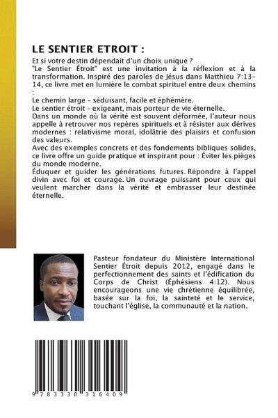 Et si votre destin dépendait d'un choix unique ?"Le Sentier Étroit" est une invitation à la réflexion et à la transformation. Inspiré des paroles de Jésus dans Matthieu 7:13-14, ce livre met en lumière le combat spirituel entre deux chemins :Le chemin large - séduisant, facile et éphémère.Le sentier étroit - exigeant, mais porteur de vie éternelle.Dans un monde où la vérité est souvent déformée, l'auteur nous appelle à retrouver nos repères spirituels et à résister aux dérives modernes : relativisme moral, idolâtrie des plaisirs et confusion des valeurs.Avec des exemples concrets et des fondements bibliques solides, ce livre offre un guide pratique et inspirant pour : Éviter les pièges du monde moderne.Éduquer et guider les générations futures. Répondre à l'appel divin avec foi et courage. Un ouvrage puissant pour ceux qui veulent marcher dans la vérité et embrasser leur destinée éternelle.