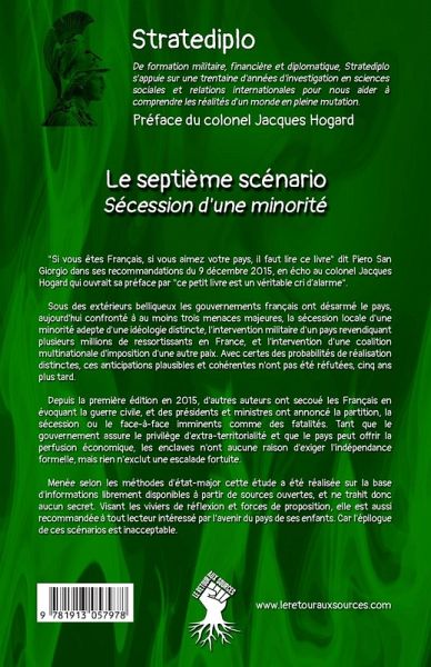 "Si vous êtes Français, si vous aimez votre pays, il faut lire ce livre" dit Piero San Giorgio dans ses recommandations du 9 décembre 2015, en écho au colonel Jacques Hogard qui ouvrait sa préface par "ce petit livre est un véritable cri d'alarme". Sous des extérieurs belliqueux les gouvernements français ont désarmé le pays, aujourd'hui confronté à au moins trois menaces majeures, la sécession locale d'une minorité adepte d'une idéologie distincte, l'intervention militaire d'un pays revendiquant plusieurs millions de ressortissants en France, et l'intervention d'une coalition multinationale d'imposition d'une autre paix. Avec certes des probabilités de réalisation distinctes, ces anticipations plausibles et cohérentes n'ont pas été réfutées, cinq ans plus tard. Depuis la première édition en 2015, d'autres auteurs ont secoué les Français en évoquant la guerre civile, et des présidents et ministres ont annoncé la partition, la sécession ou le face-à-face imminents comme des fatalités. Tant que le gouvernement assure le privilège d'extra-territorialité et que le pays peut offrir la perfusion économique, les enclaves n'ont aucune raison d'exiger l'indépendance formelle, mais rien n'exclut une escalade fortuite. Menée selon les méthodes d'état-major cette étude a été réalisée sur la base d'informations librement disponibles à partir de sources ouvertes, et ne trahit donc aucun secret. Visant les viviers de réflexion et forces de proposition, elle est aussi recommandée à tout lecteur intéressé par l'avenir du pays de ses enfants. Car l'épilogue de ces scénarios est inacceptable.
