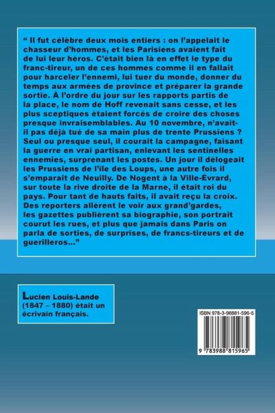 " Il fut célèbre deux mois entiers : on l'appelait le chasseur d'hommes, et les Parisiens avaient fait de lui leur héros. C'était bien là en effet le type du franc-tireur, un de ces hommes comme il en fallait pour harceler l'ennemi, lui tuer du monde, donner du temps aux armées de province et préparer la grande sortie. À l'ordre du jour sur les rapports partis de la place, le nom de Hoff revenait sans cesse, et les plus sceptiques étaient forcés de croire des choses presque invraisemblables. Au 10 novembre, n'avait-il pas déjà tué de sa main plus de trente Prussiens ? Seul ou presque seul, il courait la campagne, faisant la guerre en vrai partisan, enlevant les sentinelles ennemies, surprenant les postes. Un jour il délogeait les Prussiens de l'île des Loups, une autre fois il s'emparait de Neuilly. De Nogent à la Ville-Évrard, sur toute la rive droite de la Marne, il était roi du pays. Pour tant de hauts faits, il avait reçu la croix. Des reporters allèrent le voir aux grand'gardes, les gazettes publièrent sa biographie, son portrait courut les rues, et plus que jamais dans Paris on parla de sorties, de surprises, de francs-tireurs et de guerilleros..."