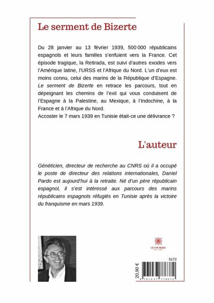 Du 28 janvier au 13 février 1939, 500¿000 républicains espagnols et leurs familles s¿enfuient vers la France. Cet épisode tragique, la Retirada, est suivi d¿autres exodes vers l¿Amérique latine, l¿URSS et l¿Afrique du Nord. L¿un d¿eux est moins connu, celui des marins de la République d¿Espagne. Le serment de Bizerte en retrace les parcours, tout en dépeignant les chemins de l¿exil qui vous conduisent de l¿Espagne à la Palestine, au Mexique, à l¿Indochine, à la France et à l¿Afrique du Nord. Accoster le 7 mars 1939 en Tunisie était-ce une délivrance ?