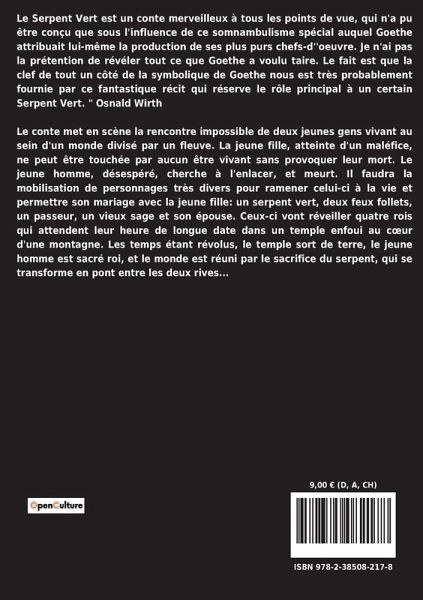 Le Serpent Vert est un conte merveilleux à tous les points de vue, qui n'a pu être conçu que sous l'influence de ce somnambulisme spécial auquel Goethe attribuait lui-même la production de ses plus purs chefs-d''oeuvre. Je n'ai pas la prétention de révéler tout ce que Goethe a voulu taire. Le fait est que la clef de tout un côté de la symbolique de Goethe nous est très probablement fournie par ce fantastique récit qui réserve le rôle principal à un certain Serpent Vert. " Osnald Wirth Le conte met en scène la rencontre impossible de deux jeunes gens vivant au sein d'un monde divisé par un fleuve. La jeune fille, atteinte d'un maléfice, ne peut être touchée par aucun être vivant sans provoquer leur mort. Le jeune homme, désespéré, cherche à l'enlacer, et meurt. Il faudra la mobilisation de personnages très divers pour ramener celui-ci à la vie et permettre son mariage avec la jeune fille: un serpent vert, deux feux follets, un passeur, un vieux sage et son épouse. Ceux-ci vont réveiller quatre rois qui attendent leur heure de longue date dans un temple enfoui au c¿ur d'une montagne. Les temps étant révolus, le temple sort de terre, le jeune homme est sacré roi, et le monde est réuni par le sacrifice du serpent, qui se transforme en pont entre les deux rives...