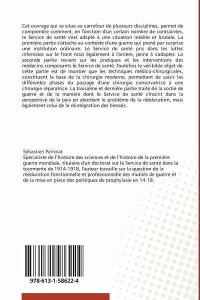 Cet ouvrage qui se situe au carrefour de plusieurs disciplines, permet de comprendre comment, en fonction d'un certain nombre de contraintes, le Service de santé s'est adapté à une situation inédite et brutale. La première partie s'attache au contexte d'une guerre qui prend par surprise une institution ordinaire. Le Service de santé pris dans les luttes infernales sur le front mais également à l'arrière, peine à s'adapter. La seconde partie revient sur les pratiques et les interventions des médecins composants le Service de santé. Toutefois le véritable objet de cette partie est de montrer que les techniques médico-chirurgicales, constituent la base de la chirurgie moderne, permettant de saisir les différentes phases du passage d'une chirurgie conservatrice à une chirurgie réparatrice. La troisième et dernière partie traite de la sortie de guerre et de la manière dont le Service de santé s'inscrit dans la perspective de la paix en abordant le problème de la rééducation, mais également celui de la réintégration des blessés.