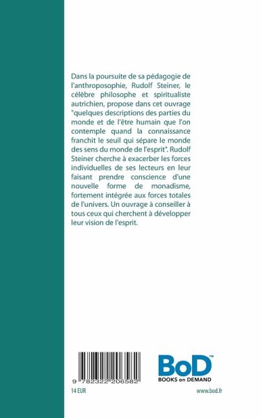 Dans la poursuite de sa pédagogie de l'anthroposophie, Rudolf Steiner, le célèbre philosophe et spiritualiste autrichien, propose dans cet ouvrage"quelques descriptions des parties du monde et de l'être humain que l'on contemple quand la connaissance franchit le seuil qui sépare le monde des sens du monde de l'esprit". Rudolf Steiner cherche à exacerber les forces individuelles de ses lecteurs en leur faisant prendre conscience d'une nouvelle forme de monadisme, fortement intégrée aux forces totales de l'univers. Un ouvrage à conseiller à tous ceux qui cherchent à développer leur vision de l'esprit.