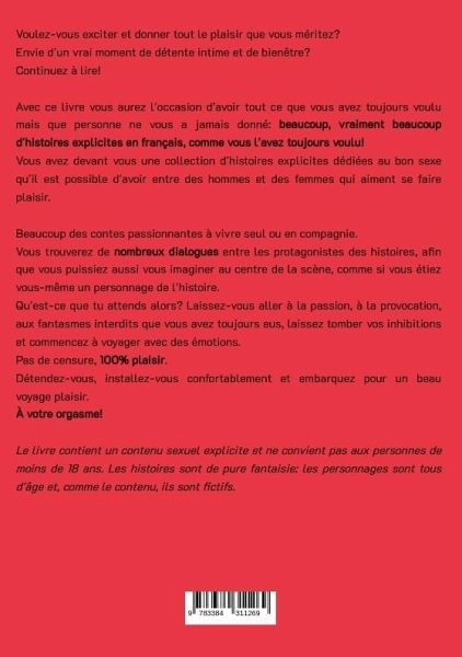 Voulez-vous exciter et donner tout le plaisir que vous méritez?Envie d'un vrai moment de détente intime et de bienêtre?Continuez à lire!Avec ce livre vous aurez l'occasion d'avoir tout ce que vous avez toujours voulu mais que personne ne vous a jamais donné: beaucoup, vraiment beaucoup d'histoires explicites en français, comme vous l'avez toujours voulu!Vous avez devant vous une collection d'histoires explicites dédiées au bon sexe qu'il est possible d'avoir entre des hommes et des femmes qui aiment se faire plaisir. Beaucoup des contes passionnantes à vivre seul ou en compagnie.Vous trouverez de nombreux dialogues entre les protagonistes des histoires, afin que vous puissiez aussi vous imaginer au centre de la scène, comme si vous étiez vous-même un personnage de l'histoire.Qu'est-ce que tu attends alors? Laissez-vous aller à la passion, à la provocation, aux fantasmes interdits que vous avez toujours eus, laissez tomber vos inhibitions et commencez à voyager avec des émotions.Pas de censure, 100 pour 100 de plaisir.Détendez-vous, installez-vous confortablement et embarquez pour un beau voyage plaisir.À votre orgasme!