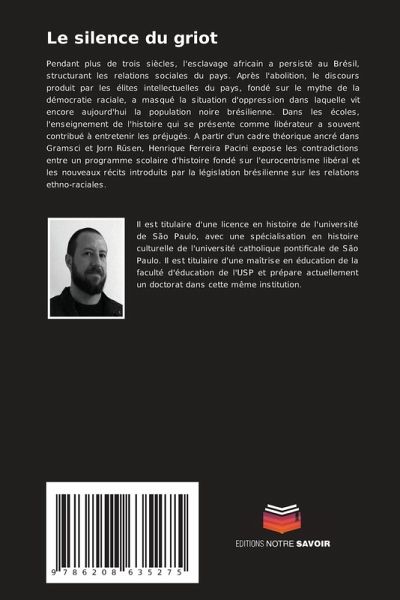 Pendant plus de trois siècles, l'esclavage africain a persisté au Brésil, structurant les relations sociales du pays. Après l'abolition, le discours produit par les élites intellectuelles du pays, fondé sur le mythe de la démocratie raciale, a masqué la situation d'oppression dans laquelle vit encore aujourd'hui la population noire brésilienne. Dans les écoles, l'enseignement de l'histoire qui se présente comme libérateur a souvent contribué à entretenir les préjugés. A partir d'un cadre théorique ancré dans Gramsci et Jorn Rüsen, Henrique Ferreira Pacini expose les contradictions entre un programme scolaire d'histoire fondé sur l'eurocentrisme libéral et les nouveaux récits introduits par la législation brésilienne sur les relations ethno-raciales.