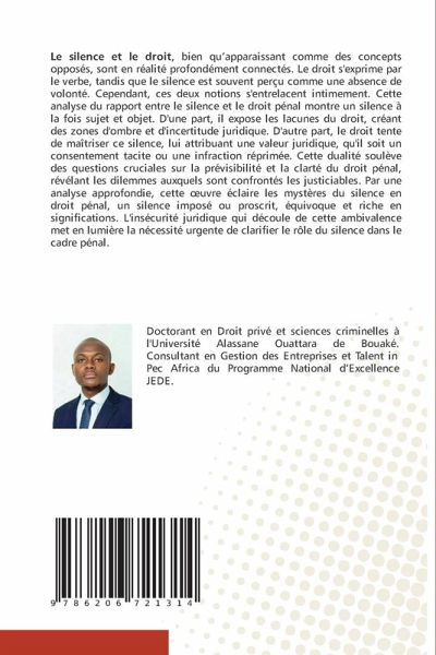 Le silence et le droit, bien qu'apparaissant comme des concepts opposés, sont en réalité profondément connectés. Le droit s'exprime par le verbe, tandis que le silence est souvent perçu comme une absence de volonté. Cependant, ces deux notions s'entrelacent intimement. Cette analyse du rapport entre le silence et le droit pénal montre un silence à la fois sujet et objet. D'une part, il expose les lacunes du droit, créant des zones d'ombre et d'incertitude juridique. D'autre part, le droit tente de maîtriser ce silence, lui attribuant une valeur juridique, qu'il soit un consentement tacite ou une infraction réprimée. Cette dualité soulève des questions cruciales sur la prévisibilité et la clarté du droit pénal, révélant les dilemmes auxquels sont confrontés les justiciables. Par une analyse approfondie, cette oeuvre éclaire les mystères du silence en droit pénal, un silence imposé ou proscrit, équivoque et riche en significations. L'insécurité juridique qui découle de cette ambivalence met en lumière la nécessité urgente de clarifier le rôle du silence dans le cadre pénal.
