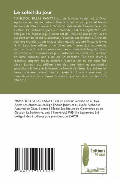 MAMADOU BILLAS KANATE est un écrivain ivoirien né à Divo. Après ses études au collège Ehoule James et au Lycée Alphonse Assamoi de Divo, il entre à l'École Supérieure de Commerce et de Gestion La Sorbonne, puis à l'université FHB. Il a également été délégué des étudiants puis président de L'AICI. La poésie est un art qui transcende les mots, exprimant l'essence des émotions. À travers des vers rythmés et des images choisies, elle capture l'instant, la vie, l'infini. La poésie célèbre l'amour, la nature, l'humanité, et explore les tourments de l'âme. Les poètes sont des artisans de la langue, offrant des miroirs à nos pensées les plus profondes. La poésie est un miroir de l'âme humaine, une aube qui se déchaîne. Elle nous invite à ressentir, imaginer, rêver, explorer l'essence de ce qui nous fait vibrer. L'amour est célébré dans des vers doux et passionnés, symbolisant la force et la beauté de l'union des âmes. L'amitié est un trésor précieux, réconfortant et apaisant, illuminant nos vies. La moralité éclaire les chemins obscurcis, guidant vers des horizons affranchis.