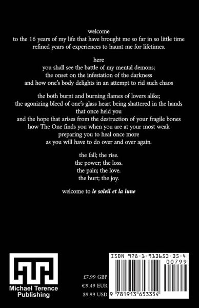 welcome to the 16 years of my life that have brought me so far in so little time refined years of experiences to haunt me for lifetimes. here you shall see the battle of my mental demons; the onset on the infestation of the darkness and how one's body delights in an attempt to rid such chaos the both burnt and burning flames of lovers alike; the agonizing bleed of one's glass heart being shattered in the hands that once held you and the hope that arises from the destruction of your fragile bones how The One finds you when you are at your most weak preparing you to heal once more as you will have to do over and over again. the fall; the rise. the power; the loss. the pain; the love. the hurt; the joy. welcome to le soleil et la lune