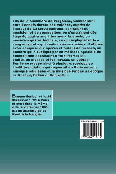 Fils de la cuisinière de Pergolèse, Guimbardini aurait acquis durant son enfance, auprès de l'auteur de La serva padrona, son talent de musicien et de compositeur en s'entraînant dès l'âge de quatre ans à tourner la broche en mesure à quatre temps , ce qui expliquerait le sang musical qui coule dans ses veines. Il affirme avoir composé dix opéras et autant de messes, un nombre qui s'explique par sa méthode spéciale de composition consistant à transformer les opéras en messes et les messes en opéras. Scribe se moque ainsi à plusieurs reprises de l'indifférenciation qui règnerait en Italie entre la musique religieuse et la musique lyrique à l'époque de Rossini, Bellini et Donizetti...
