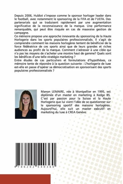 Depuis 2006, Hublot s'impose comme le sponsor horloger leader dans le football, avec notamment le sponsoring de la FIFA et de l'UEFA. Des partenariats qui se traduisent rapidement par une augmentation significative de la reconnaissance de la marque. Une performance remarquable, qui peut e_tre risque_e en cas de mauvaise gestion de campagne. Ce me_moire propose une approche innovante du sponsoring de la Haute Horlogerie dans les sports populaires professionnalise_s. Il s'agit de comprendre comment les maisons horloge_res tentent de be_ne_ficier de la force fe_de_ratrice de ces sports ainsi que de leurs grandes et riches audiences au profit de la marque. Comment s'adresser a_ une cible qui n'a pas les moyens de s'acheter une montre haut de gamme? Quels sont les be_ne_fices d'une telle strate_gie marketing ? Entre études de cas particuliers et formulations d'hypothèses, ce mémoire tente de répondre à la question suivante : L'horlogerie de luxe est-elle en passe d'opérer sa démocratisation en sponsorisant des sports populaires professionnalisés ?