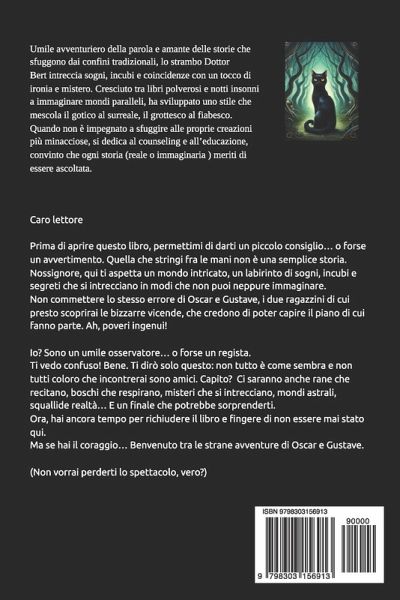 Caro lettore Prima di aprire questo libro, permettimi di darti un piccolo consiglio... o forse un avvertimento. Quella che stringi fra le mani non è una semplice storia. Nossignore, qui ti aspetta un mondo intricato, un labirinto di sogni, incubi e segreti che si intrecciano in modi che non puoi neppure immaginare. Non commettere lo stesso errore di Oscar e Gustave, i due ragazzini di cui presto scoprirai le bizzarre vicende, che credono di poter capire il piano di cui fanno parte. Ah, poveri ingenui! Io? Sono un umile osservatore... o forse un regista. >Ora, hai ancora tempo per richiudere il libro e fingere di non essere mai stato qui. Ma se hai il coraggio... Benvenuto tra le strane avventure di Oscar e Gustave. (Non vorrai perderti lo spettacolo, vero?)