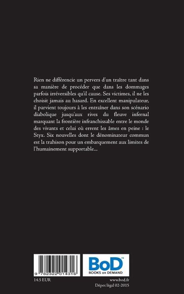 Rien ne différencie un pervers d'un traître tant dans sa manière de procéder que dans les dommages parfois irréversibles qu'il cause. Ses victimes, il ne les choisit jamais au hasard. En excellent manipulateur, il parvient toujours à les entraîner dans son scénario diabolique jusqu'aux rives du fleuve infernal marquant la frontière infranchissable entre le monde des vivants et celui où errent les âmes en peine : le Styx. Six nouvelles dont le dénominateur commun est la trahison pour un embarquement aux limites de l'humainement supportable...