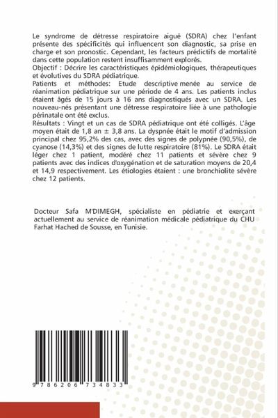 Le syndrome de détresse respiratoire aiguë (SDRA) chez l'enfant présente des spécificités qui influencent son diagnostic, sa prise en charge et son pronostic. Cependant, les facteurs prédictifs de mortalité dans cette population restent insuffisamment explorés.Objectif : Décrire les caractéristiques épidémiologiques, thérapeutiques et évolutives du SDRA pédiatrique.Patients et méthodes: Etude descriptive menée au service de réanimation pédiatrique sur une période de 4 ans. Les patients inclus étaient âgés de 15 jours à 16 ans diagnostiqués avec un SDRA. Les nouveau-nés présentant une détresse respiratoire liée à une pathologie périnatale ont été exclus.Résultats : Vingt et un cas de SDRA pédiatrique ont été colligés. L'âge moyen était de 1,8 an ± 3,8 ans. La dyspnée était le motif d'admission principal chez 95,2% des cas, avec des signes de polypnée (90,5%), de cyanose (14,3%) et des signes de lutte respiratoire (81%). Le SDRA était léger chez 1 patient, modéré chez 11 patients et sévère chez 9 patients avec des indices d'oxygénation et de saturation moyens de 20,4 et 14,9 respectivement. Les étiologies étaient : une bronchiolite sévère chez 12 patients.