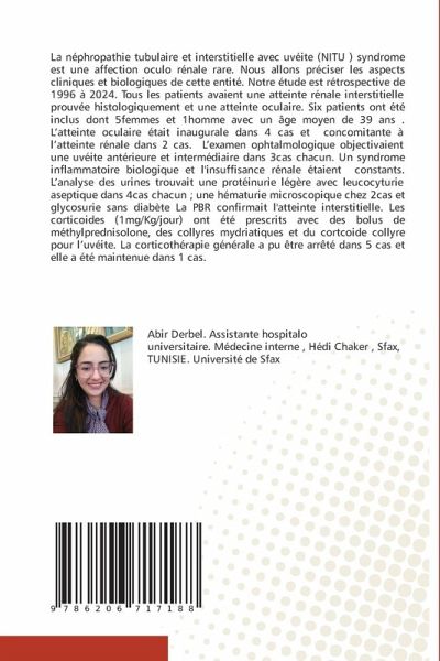 La néphropathie tubulaire et interstitielle avec uvéite (NITU ) syndrome est une affection oculo rénale rare. Nous allons préciser les aspects cliniques et biologiques de cette entité. Notre étude est rétrospective de 1996 à 2024. Tous les patients avaient une atteinte rénale interstitielle prouvée histologiquement et une atteinte oculaire. Six patients ont été inclus dont 5femmes et 1homme avec un âge moyen de 39 ans . L'atteinte oculaire était inaugurale dans 4 cas et concomitante à l'atteinte rénale dans 2 cas. L'examen ophtalmologique objectivaient une uvéite antérieure et intermédiaire dans 3cas chacun. Un syndrome inflammatoire biologique et l'insuffisance rénale étaient constants. L'analyse des urines trouvait une protéinurie légère avec leucocyturie aseptique dans 4cas chacun ; une hématurie microscopique chez 2cas et glycosurie sans diabète La PBR confirmait l'atteinte interstitielle. Les corticoides (1mg/Kg/jour) ont été prescrits avec des bolus de méthylprednisolone, des collyres mydriatiques et du cortcoide collyre pour l'uvéite. La corticothérapie générale a pu être arrêté dans 5 cas et elle a été maintenue dans 1 cas.
