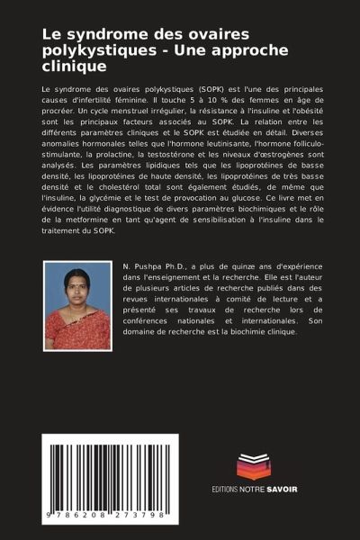 Le syndrome des ovaires polykystiques (SOPK) est l'une des principales causes d'infertilité féminine. Il touche 5 à 10 % des femmes en âge de procréer. Un cycle menstruel irrégulier, la résistance à l'insuline et l'obésité sont les principaux facteurs associés au SOPK. La relation entre les différents paramètres cliniques et le SOPK est étudiée en détail. Diverses anomalies hormonales telles que l'hormone leutinisante, l'hormone folliculo-stimulante, la prolactine, la testostérone et les niveaux d'oestrogènes sont analysés. Les paramètres lipidiques tels que les lipoprotéines de basse densité, les lipoprotéines de haute densité, les lipoprotéines de très basse densité et le cholestérol total sont également étudiés, de même que l'insuline, la glycémie et le test de provocation au glucose. Ce livre met en évidence l'utilité diagnostique de divers paramètres biochimiques et le rôle de la metformine en tant qu'agent de sensibilisation à l'insuline dans le traitement du SOPK.