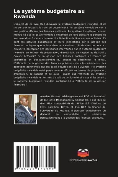 L'objectif de ce livre était d'évaluer le système budgétaire rwandais et de laisser aux lecteurs le soin de déterminer si le système conduit ou non à une gestion efficace des finances publiques. Le système budgétaire national montre ce que le gouvernement a l'intention de faire pendant la période de son calendrier fiscal et comment il a l'intention de financer ses activités. Ce sont ces activités budgétaires et leurs implications sur la gestion des finances publiques que le livre cherche à évaluer. L'étude cherche donc à : évaluer la perception des personnes interrogées sur le système budgétaire rwandais en termes de préparation, d'exécution, de rapport et de suivi ; évaluer l'efficacité de la gestion des finances publiques en termes de conformité et d'assainissement du budget et déterminer le niveau d'efficacité de la gestion des finances publiques dans les ministères. Les questions pertinentes qui ont guidé l'étude sont les suivantes : le système budgétaire rwandais est-il perçu comme efficace en termes de préparation, d'exécution, de rapport et de suivi ; quelle est l'efficacité du système budgétaire rwandais en termes d'audit de conformité et d'assainissement ; le système budgétaire rwandais contribue-t-il à l'efficacité de la gestion financière ?