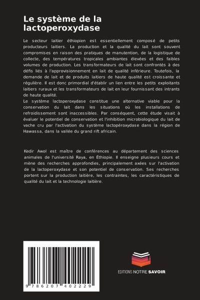 Le secteur laitier éthiopien est essentiellement composé de petits producteurs laitiers. La production et la qualité du lait sont souvent compromises en raison des pratiques de manutention, de la logistique de collecte, des températures tropicales ambiantes élevées et des faibles volumes de production. Les transformateurs de lait sont confrontés à des défis liés à l'approvisionnement en lait de qualité inférieure. Toutefois, la demande de lait et de produits laitiers de haute qualité est croissante et régulière. Il est donc primordial d'établir un lien entre les petits exploitants laitiers ruraux et les transformateurs de lait en leur fournissant des intrants de haute qualité.Le système lactoperoxydase constitue une alternative viable pour la conservation du lait dans les situations où les installations de refroidissement sont inaccessibles. Par conséquent, cette étude visait à évaluer le potentiel de conservation et l'inhibition microbiologique du lait de vache cru par l'activation du système lactopéroxydase dans la région de Hawassa, dans la vallée du grand rift africain.
