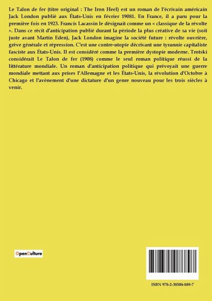 Le Talon de fer (titre original : The Iron Heel) est un roman de l'écrivain américain Jack London publié aux États-Unis en février 19081. En France, il a paru pour la première fois en 1923. Francis Lacassin le désignait comme un « classique de la révolte ». Dans ce récit d'anticipation publié durant la période la plus créative de sa vie (soit juste avant Martin Eden), Jack London imagine la société future : révolte ouvrière, grève générale et répression. C'est une contre-utopie décrivant une tyrannie capitaliste fasciste aux États-Unis. Il est considéré comme la première dystopie moderne. Trotski considérait Le Talon de fer (1908) comme le seul roman politique réussi de la littérature mondiale. Un roman d'anticipation politique qui prévoyait une guerre mondiale mettant aux prises l'Allemagne et les États-Unis, la révolution d'Octobre à Chicago et l'avènement d'une dictature d'un genre nouveau pour les trois siècles à venir.