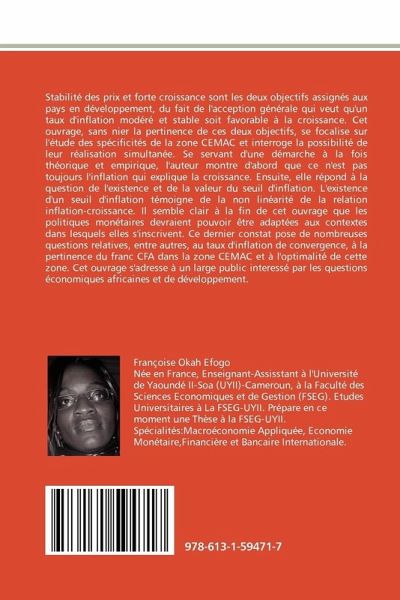 Stabilité des prix et forte croissance sont les deux objectifs assignés aux pays en développement, du fait de l'acception générale qui veut qu'un taux d'inflation modéré et stable soit favorable à la croissance. Cet ouvrage, sans nier la pertinence de ces deux objectifs, se focalise sur l'étude des spécificités de la zone CEMAC et interroge la possibilité de leur réalisation simultanée. Se servant d'une démarche à la fois théorique et empirique, l'auteur montre d'abord que ce n'est pas toujours l'inflation qui explique la croissance. Ensuite, elle répond à la question de l'existence et de la valeur du seuil d'inflation. L'existence d'un seuil d'inflation témoigne de la non linéarité de la relation inflation-croissance. Il semble clair à la fin de cet ouvrage que les politiques monétaires devraient pouvoir être adaptées aux contextes dans lesquels elles s'inscrivent. Ce dernier constat pose de nombreuses questions relatives, entre autres, au taux d'inflation de convergence, à la pertinence du franc CFA dans la zone CEMAC et à l'optimalité de cette zone. Cet ouvrage s'adresse à un large public interessé par les questions économiques africaines et de développement.