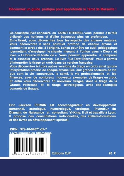 Ce deuxième livre consacré au TAROT vous permet à la fois d¿élargir vos horizons et d¿aller beaucoup plus en profondeur. En le lisant, vous découvrirez tous les aspects des arcanes majeurs. Vous découvrirez le sens spirituel profond de chaque arcane et comment le tarot a été, à l¿origine, conçu pour être un outil pédagogique permettant d¿enseigner le chemin menant à l¿union avec « Dieu » et avec « La Source de toute vie ». Vous pourrez apprendre à comparer et à associer deux arcanes. Le livre "Le Tarot Eternel" vous a permis d¿interpréter le tirage en croix dans sa version française. Vous découvrirez ici trois autres versions du tirage en croix ainsi qüune interprétation précise de chaque arcane liée aux grands secteurs de vie que sont la vie amoureuse, la santé, la vie professionnelle et les finances, avec de nombreux nouveaux exemples de tirages en croix. Et enfin vous découvrirez 16 nouveaux tirages, dont le tirage de la Grande Prêtresse et le tirage astrologique, avec des exemples concrets de tirages.