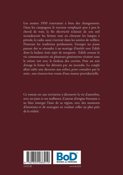 Les années 1930 s'ouvraient à bien des changements. Dans les campagnes, Le tracteur remplaçait peu à peu le cheval de trait, la fée électricité éclairait de son oeil incandescent les fermes tout en côtoyant les lampes à pétrole, la radio aussi s'invitait dans les soirées de veillées. Pourtant les traditions perduraient. Georges un jeune paysan dut se résoudre à un mariage d'intérêt avec Édith dont la laideur était sujet de moquerie. Édith connut la vie communautaire où plusieurs générations vivaient sous le même toit avec le fardeau des corvées. Puis un soir d'orage la ferme fut détruite par un incendie. Le couple allait subir une descente aux enfers, pour connaître par la suite, une résurrection venue d'une manne providentielle.