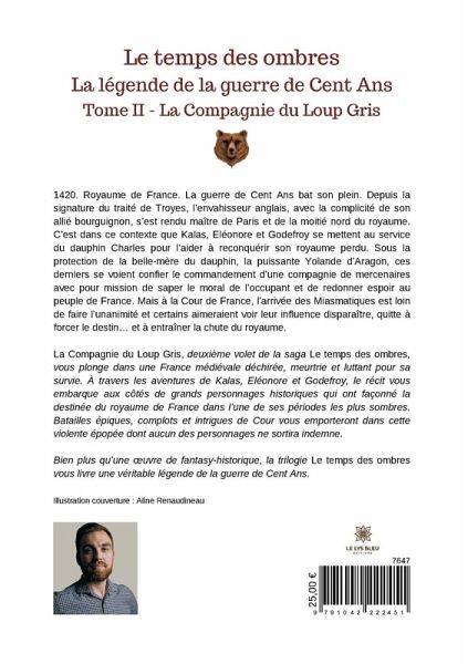 1420. Royaume de France. La guerre de Cent Ans bat son plein. Depuis la signature du traité de Troyes, l¿envahisseur anglais, avec la complicité de son allié bourguignon, s¿est rendu maître de Paris et de la moitié nord du royaume. C¿est dans ce contexte que Kalas, Eléonore et Godefroy se mettent au service du dauphin Charles pour l¿aider à reconquérir son royaume perdu. Sous la protection de la belle-mère du dauphin, la puissante Yolande d¿Aragon, ces derniers se voient confier le commandement d¿une compagnie de mercenaires avec pour mission de saper le moral de l¿occupant et de redonner espoir au peuple de France. Mais à la Cour de France, l¿arrivée des Miasmatiques est loin de faire l¿unanimité et certains aimeraient voir leur influence disparaître, quitte à forcer le destin¿ et à entraîner la chute du royaume. La Compagnie du Loup Gris, deuxième volet de la saga Le temps des ombres, vous plonge dans une France médiévale déchirée, meurtrie et luttant pour sa survie. À travers les aventures de Kalas, Eléonore et Godefroy, le récit vous embarque aux côtés de grands personnages historiques qui ont façonné la destinée du royaume de France dans l¿une de ses périodes les plus sombres. Batailles épiques, complots et intrigues de Cour vous emporteront dans cette violente épopée dont aucun des personnages ne sortira indemne. Bien plus qüune ¿uvre de fantasy-historique, la trilogie Le temps des ombres vous livre une véritable légende de la guerre de Cent Ans.