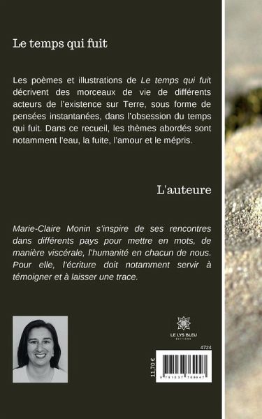 Les poèmes et illustrations de Le temps qui fuit décrivent des morceaux de vie de différents acteurs de l¿existence sur Terre, sous forme de pensées instantanées, dans l¿obsession du temps qui fuit. Dans ce recueil, les thèmes abordés sont notamment l¿eau, la fuite, l¿amour et le mépris.