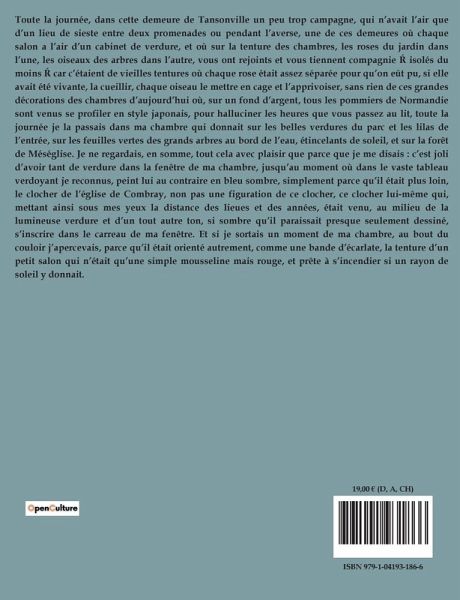 Toute la journée, dans cette demeure de Tansonville un peu trop campagne, qui n¿avait l¿air que d¿un lieu de sieste entre deux promenades ou pendant l¿averse, une de ces demeures où chaque salon a l¿air d¿un cabinet de verdure, et où sur la tenture des chambres, les roses du jardin dans l¿une, les oiseaux des arbres dans l¿autre, vous ont rejoints et vous tiennent compagnie ¿ isolés du moins ¿ car c¿étaient de vieilles tentures où chaque rose était assez séparée pour qüon eût pu, si elle avait été vivante, la cueillir, chaque oiseau le mettre en cage et l¿apprivoiser, sans rien de ces grandes décorations des chambres d¿aujourd¿hui où, sur un fond d¿argent, tous les pommiers de Normandie sont venus se profiler en style japonais, pour halluciner les heures que vous passez au lit, toute la journée je la passais dans ma chambre qui donnait sur les belles verdures du parc et les lilas de l¿entrée, sur les feuilles vertes des grands arbres au bord de l¿eau, étincelants de soleil, et sur la forêt de Méséglise. Je ne regardais, en somme, tout cela avec plaisir que parce que je me disais : c¿est joli d¿avoir tant de verdure dans la fenêtre de ma chambre, jusqüau moment où dans le vaste tableau verdoyant je reconnus, peint lui au contraire en bleu sombre, simplement parce qüil était plus loin, le clocher de l¿église de Combray, non pas une figuration de ce clocher, ce clocher lui-même qui, mettant ainsi sous mes yeux la distance des lieues et des années, était venu, au milieu de la lumineuse verdure et d¿un tout autre ton, si sombre qüil paraissait presque seulement dessiné, s¿inscrire dans le carreau de ma fenêtre. Et si je sortais un moment de ma chambre, au bout du couloir j¿apercevais, parce qüil était orienté autrement, comme une bande d¿écarlate, la tenture d¿un petit salon qui n¿était qüune simple mousseline mais rouge, et prête à s¿incendier si un rayon de soleil y donnait.