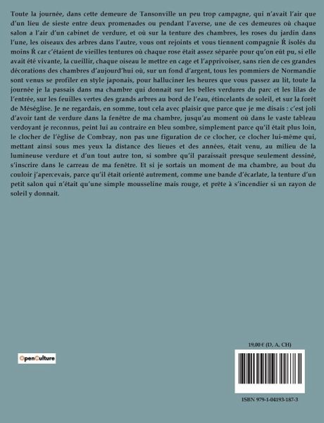 Toute la journée, dans cette demeure de Tansonville un peu trop campagne, qui n¿avait l¿air que d¿un lieu de sieste entre deux promenades ou pendant l¿averse, une de ces demeures où chaque salon a l¿air d¿un cabinet de verdure, et où sur la tenture des chambres, les roses du jardin dans l¿une, les oiseaux des arbres dans l¿autre, vous ont rejoints et vous tiennent compagnie ¿ isolés du moins ¿ car c¿étaient de vieilles tentures où chaque rose était assez séparée pour qüon eût pu, si elle avait été vivante, la cueillir, chaque oiseau le mettre en cage et l¿apprivoiser, sans rien de ces grandes décorations des chambres d¿aujourd¿hui où, sur un fond d¿argent, tous les pommiers de Normandie sont venus se profiler en style japonais, pour halluciner les heures que vous passez au lit, toute la journée je la passais dans ma chambre qui donnait sur les belles verdures du parc et les lilas de l¿entrée, sur les feuilles vertes des grands arbres au bord de l¿eau, étincelants de soleil, et sur la forêt de Méséglise. Je ne regardais, en somme, tout cela avec plaisir que parce que je me disais : c¿est joli d¿avoir tant de verdure dans la fenêtre de ma chambre, jusqüau moment où dans le vaste tableau verdoyant je reconnus, peint lui au contraire en bleu sombre, simplement parce qüil était plus loin, le clocher de l¿église de Combray, non pas une figuration de ce clocher, ce clocher lui-même qui, mettant ainsi sous mes yeux la distance des lieues et des années, était venu, au milieu de la lumineuse verdure et d¿un tout autre ton, si sombre qüil paraissait presque seulement dessiné, s¿inscrire dans le carreau de ma fenêtre. Et si je sortais un moment de ma chambre, au bout du couloir j¿apercevais, parce qüil était orienté autrement, comme une bande d¿écarlate, la tenture d¿un petit salon qui n¿était qüune simple mousseline mais rouge, et prête à s¿incendier si un rayon de soleil y donnait.