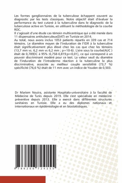 Les formes ganglionnaires de la tuberculose échappent souvent au diagnostic par les tests classiques. Notre objectif était d'évaluer la performance du test cutané à la tuberculine dans le diagnostic de la tuberculose active en Tunisie, en utilisant la méthodologie de la courbe ROC.Il s'agissait d'une étude cas-témoin multicentrique qui a été menée dans 11 dispensaires antituberculeux(DAT) en Tunisie en 2014.Au total, nous avons inclus 1053 patients répartis en 339 cas et 714 témoins. Le diamètre moyen de l'induration de l'IDR à la tuberculine était significativement plus élevé chez les cas que chez les témoins (13,7 mm vs. 6,2 mm vs 6,2 mm ; p=10-6). L'aire sous la courbe(AUC ) était de 0,789[IC à 95% :0,758-0,819;p=0,01], ce qui correspond à un pouvoir discriminant modéré pour ce test. La valeur seuil du diamètre de l'induration de l'intradermo réaction à la tuberculine la plus discriminative, associée au meilleur couple sensibilité (73,7 %) spécificité (76,6 %) était de 11 mm avec un indice de Youden de 0,503.