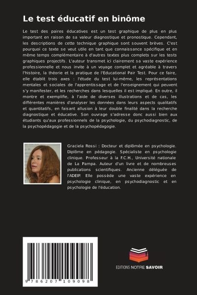 Le test des paires éducatives est un test graphique de plus en plus important en raison de sa valeur diagnostique et pronostique. Cependant, les descriptions de cette technique graphique sont souvent brèves. C'est pourquoi ce texte se veut utile en tant que connaissance spécifique et en même temps complémentaire à d'autres textes plus complets sur les tests graphiques projectifs. L'auteur transmet ici clairement sa vaste expérience professionnelle et nous invite à un voyage complet et agréable à travers l'histoire, la théorie et la pratique de l'Educational Pair Test. Pour ce faire, elle établit trois axes : l'étude du test lui-même, les représentations mentales et sociales de l'apprentissage et de l'enseignement qui peuvent s'y manifester, et les recherches dans lesquelles il est impliqué. En outre, il montre et exemplifie, à l'aide de diverses illustrations et de cas, les différentes manières d'analyser les données dans leurs aspects qualitatifs et quantitatifs, en faisant allusion à leur double finalité dans la recherche diagnostique et éducative. Son ouvrage s'adresse donc aussi bien aux étudiants qu'aux professionnels de la psychologie, du psychodiagnostic, de la psychopédagogie et de la psychopédagogie.