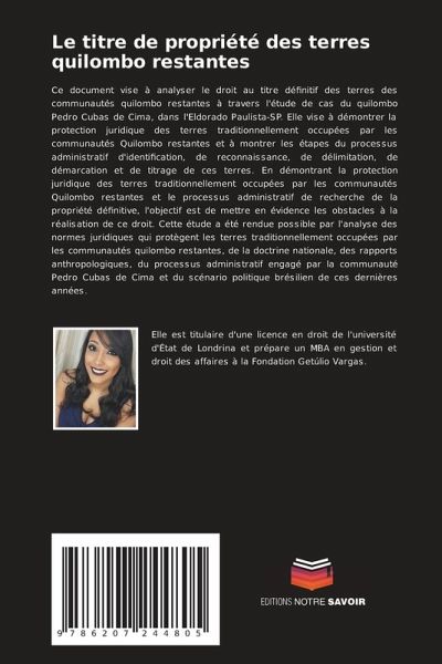 Ce document vise à analyser le droit au titre définitif des terres des communautés quilombo restantes à travers l'étude de cas du quilombo Pedro Cubas de Cima, dans l'Eldorado Paulista-SP. Elle vise à démontrer la protection juridique des terres traditionnellement occupées par les communautés Quilombo restantes et à montrer les étapes du processus administratif d'identification, de reconnaissance, de délimitation, de démarcation et de titrage de ces terres. En démontrant la protection juridique des terres traditionnellement occupées par les communautés Quilombo restantes et le processus administratif de recherche de la propriété définitive, l'objectif est de mettre en évidence les obstacles à la réalisation de ce droit. Cette étude a été rendue possible par l'analyse des normes juridiques qui protègent les terres traditionnellement occupées par les communautés quilombo restantes, de la doctrine nationale, des rapports anthropologiques, du processus administratif engagé par la communauté Pedro Cubas de Cima et du scénario politique brésilien de ces dernières années.