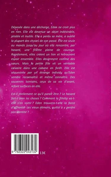 Déposée dans une décharge, Eden ne croit plus en rien. Elle est devenue un objet indésirable, jetable et inutile. Elle a perdu sa mère, a oublié la plupart des choses de son passé. Elle est seule au monde jusqu'au jour où elle rencontre, par hasard, une fillette pleine de courage. Rapidement, elles créent un lien et retrouvent espoir ensemble. Elles deviennent comme des soeurs. Mais la petite fille vit un véritable calvaire dans une cabane en forêt. Elle est séquestrée par un étrange individu qu'Eden semble reconnaître et même connaître. Des souvenirs lointains, ceux de sa vie d'avant, refont surfaces en elle. Est-il réellement ce qu'il paraît être ? Le hasard fait-il bien les choses ? Comment la fillette va-t-elle s'en sortir ? Eden trouvera-t-elle la force d'affronter ces vieux démons, quitte à y perdre son identité ?