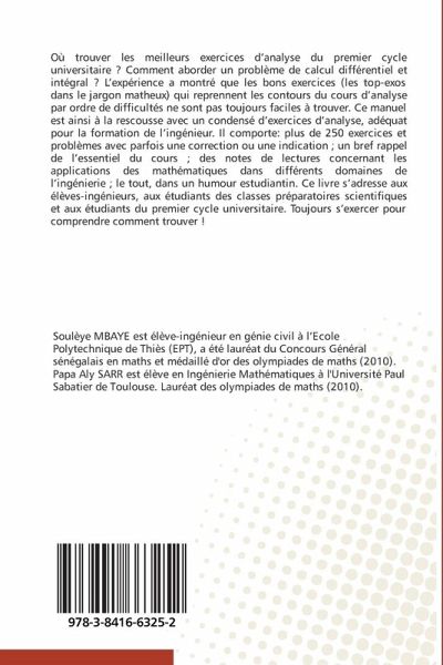 Où trouver les meilleurs exercices d'analyse du premier cycle universitaire ? Comment aborder un problème de calcul différentiel et intégral ? L'expérience a montré que les bons exercices (les top-exos dans le jargon matheux) qui reprennent les contours du cours d'analyse par ordre de difficultés ne sont pas toujours faciles à trouver. Ce manuel est ainsi à la rescousse avec un condensé d'exercices d'analyse, adéquat pour la formation de l'ingénieur. Il comporte: plus de 250 exercices et problèmes avec parfois une correction ou une indication ; un bref rappel de l'essentiel du cours ; des notes de lectures concernant les applications des mathématiques dans différents domaines de l'ingénierie ; le tout, dans un humour estudiantin. Ce livre s'adresse aux élèves-ingénieurs, aux étudiants des classes préparatoires scientifiques et aux étudiants du premier cycle universitaire. Toujours s'exercer pour comprendre comment trouver !
